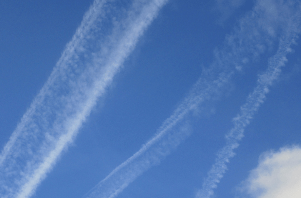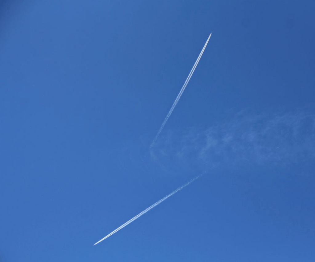 2. Persistent non-spreading contrails: They look like long white line of cloud that remains visible in the sky even after the airplane has disappeared to our eyes. It shows that the air through which the airplane is flying is very humid, and there is a large amount of water vapor available to form a persistent contrail without a strong wind to spread it.